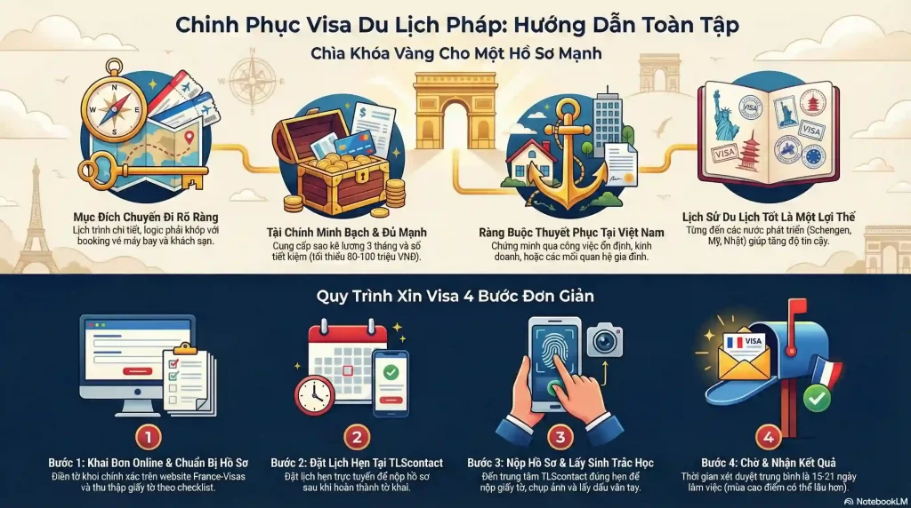 Điểm quan trọng nhất là hồ sơ phải minh bạch, logic và đầy đủ thông tin theo yêu cầu của France-Visas và TLScontact.