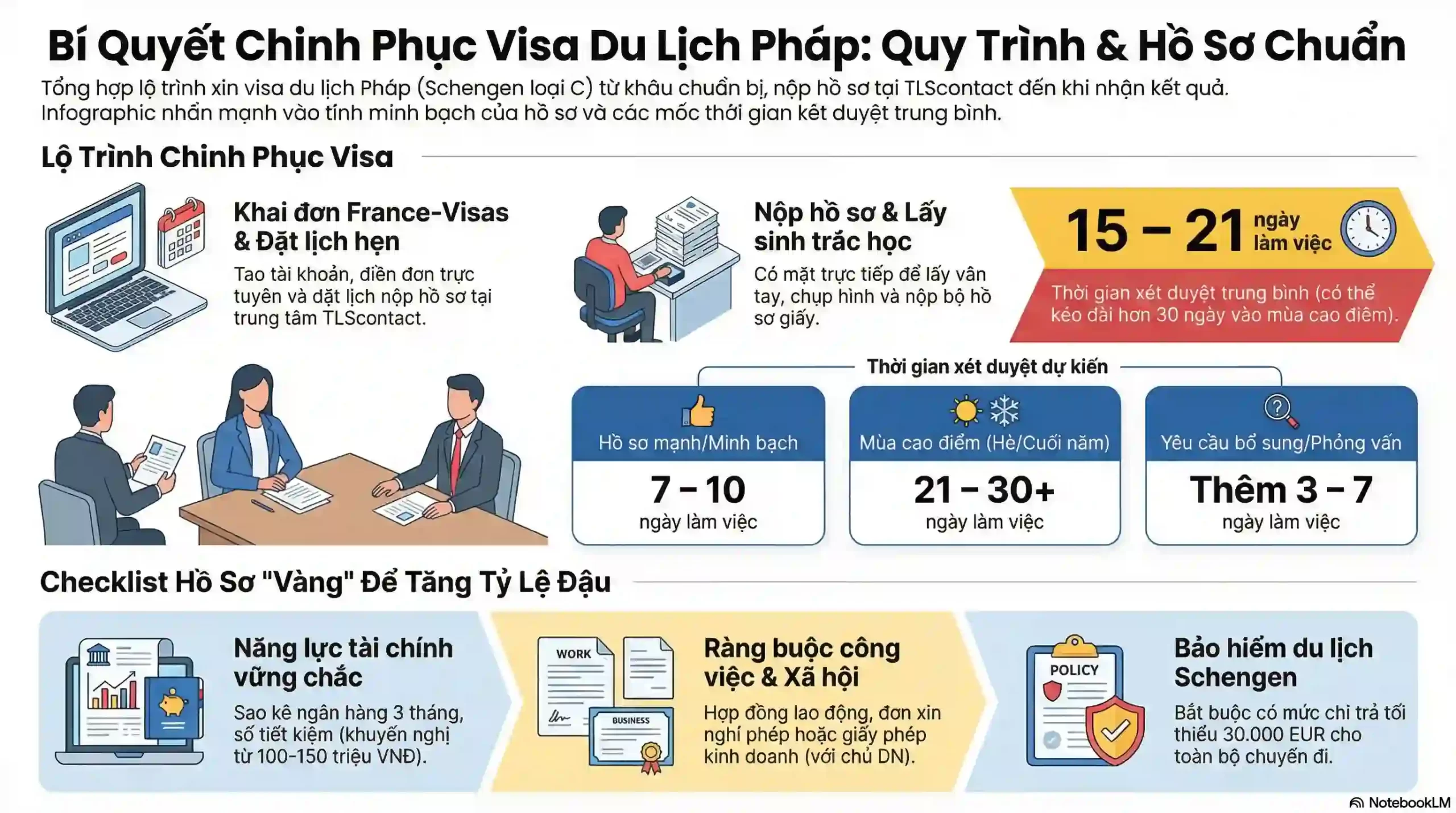 Thời gian xét duyệt trung bình từ 15 đến 21 ngày. Nếu hồ sơ sạch và đầy đủ, bạn sẽ nhận được visa đúng lịch. Trường hợp thiếu giấy tờ, bạn sẽ được yêu cầu bổ sung và thời gian xét duyệt có thể kéo dài.